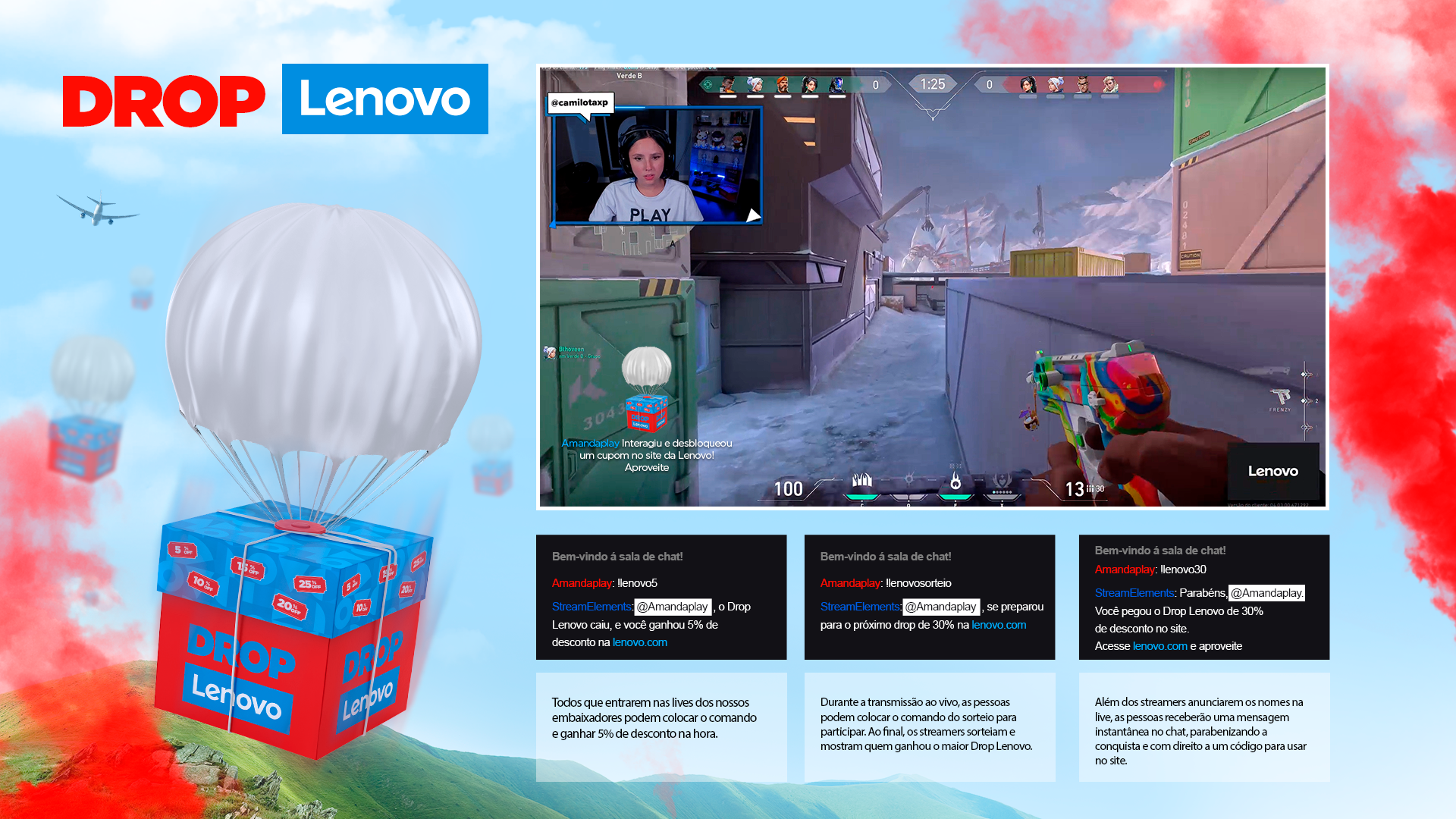 Desenvolvemos o drop para estimular as vendas de Lenovo entre o público gamer, distribuindo e sorteando cupons de descontos no chat das lives de diversos streamers parceiros.